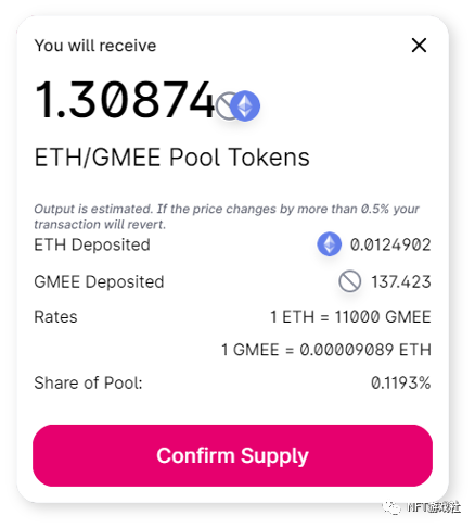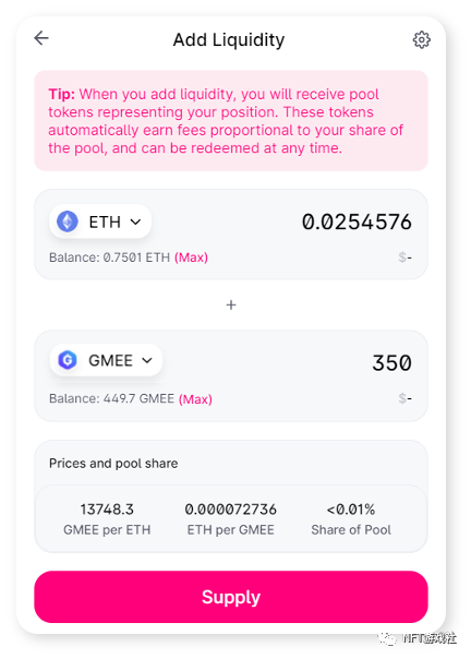 2.点击“Supply”,配对ETH/GMEE和supply liquidity。