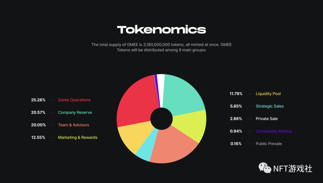 GMEE的总供应量为3,180,000,000个代币,全部一次性铸造。GMEE不会因使用而被烧毁,而是会在被玩家用于支付游戏费用和NFT购买和升级后重新引入经济。