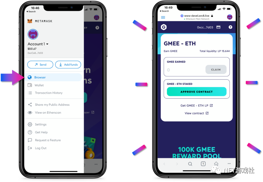 在Metamask上,转到侧栏菜单并选择“Browser”,到达此处后,该过程与访问GAMEE界面时在桌面上的过程一样。