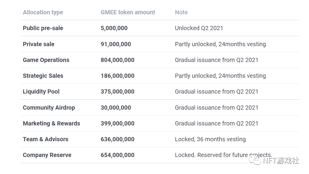 在代币发行的前12个月后,流通量将高达总供应量的33%。不过,预计GMEE的实际发行量会略低于解锁时间表。在新游戏产品准备好增长和扩展之前,不会发布游戏运营和营销与奖励。