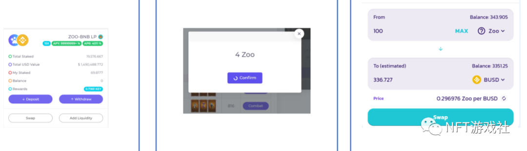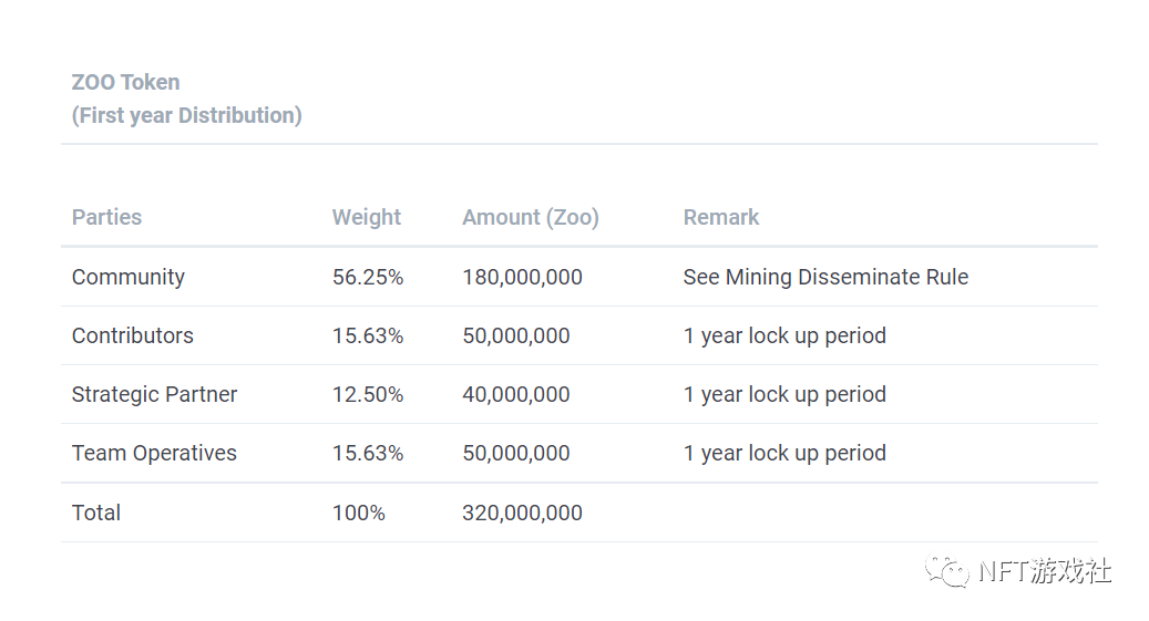 玩家可以通过质押NFT资产获得zoo token。zoo token由zoo平台发行。该团队最初以AMM(Pancake)提供流动性,玩家可以通过ZOO-USDT对在AMM(Pancake)中进行交易。