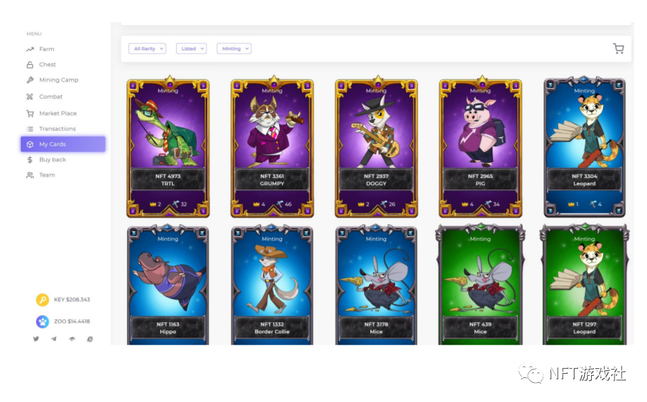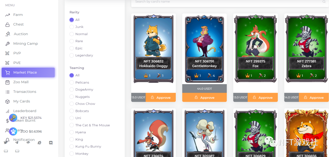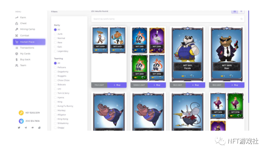 2.玩家需去市场购买自己想要的NFT卡片(可以选择稀有度类型和组队类型)