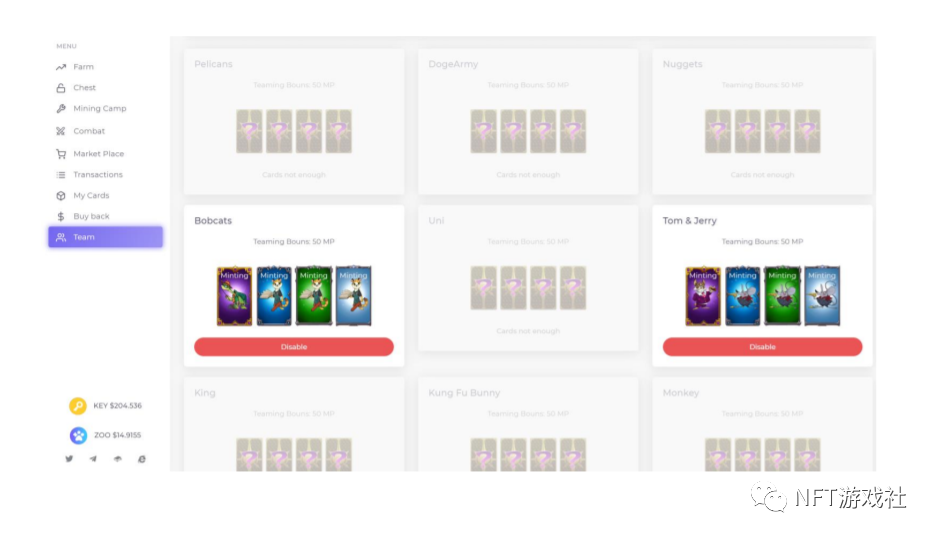 3.玩家可以点击Team,去组队战斗,或者玩家也可以在PVP或PVE中选择自己的NFT卡战斗。
