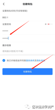 创建钱包----设置密码--记录助记词--确认助记词--生成钱包
