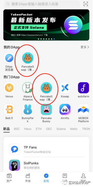 1、点击【发现】,点击【PancakeSwap薄饼】