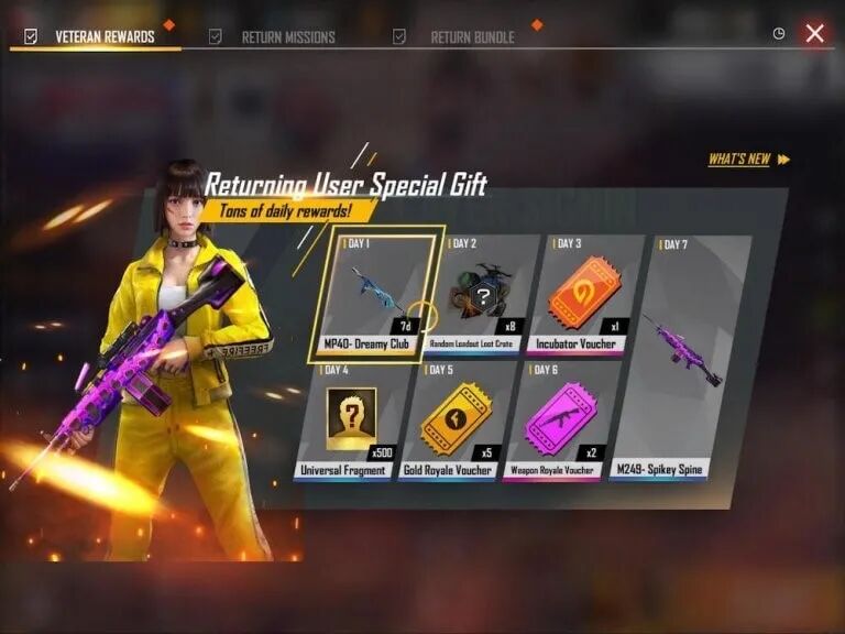《Garena Free Fire》的回归玩家登录奖励是专属武器皮肤,这是一个非常有价值的奖励,尤其是对于喜欢免费玩该游戏的人来说。活动中的其他内容还包括回归任务和促销礼包。