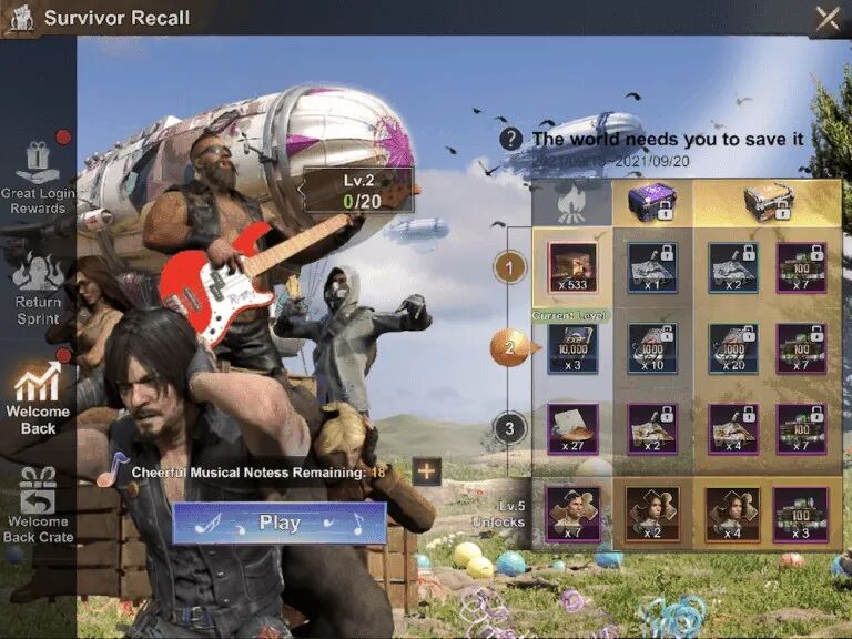 《State of Survival》游戏里的Survivor Recall Battle Pass有三个等级,一个是免费,还有两个是不同额度的付费。玩家们可以通过正常的玩法活动获得点数,然后通过让Rusty弹吉他插入到pass当中。