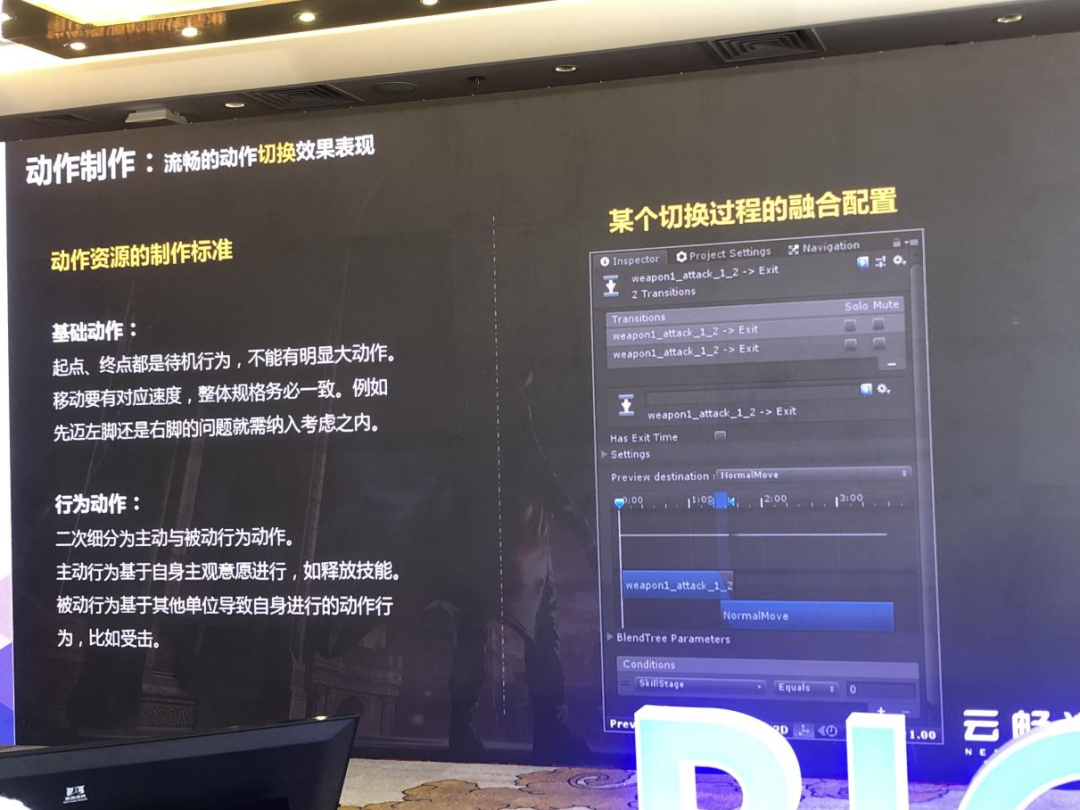 接下来,我会分以下几个部分来介绍以下我们在研发过程中的一些关键的制作方面:首先第一部分是角色制作,为了还原主机端的一个基本的画面的质感,我们在《鬼泣.巅峰之战》中不断的去优化页面和建模。因此,在保证高帧率的流通前提下,我们进行大量深度的一些效果制作,比如说像一些材质、模型我们会按照PBR的流程去制作,然后针对头发、皮肤这些部位使用了一些特殊的处理效果和材质。对于角色头发的制作方面,我们采用了两个pass的渲染,为了体现原作中的柔顺质感,同时还需要兼容移动端的一些性能的限制,我们把头发分成了三个层次。第一层为内层,用来防止穿模的,是一个相对固定的层次,贴图是一个不透明的状态;第二层为外层,外层的状态打造玩家角色的基础外形,这样需要还原角色设计,在这方面贴图会比较丰富、层次也比较丰富;第三层是修饰层,对外部加入修理的外形,增加细节,这样可以体现玩家个性,或者说增加角色的生动感,通过三层这样的结合我们最基本的把这样一个鬼泣原著角色的一些魅力展现出来。在角色的皮肤方面,我们在皮肤上使用了预积分皮肤次表面散射lut图的sss效果。主要是在实现的效果上,我们尽量在色泽表达上偏向写实硬朗的风格,一是为了还原鬼泣的原作,更偏向于暗黑哥特风;再者则是为了与我们市面上一些小清新或网红脸的手游做出区分。除此之外,为了让这个角色在融进场景的时候显得更加立体生动,我们在场景制作过程中也提供了可控微调GI的面板。经过微调之后,在不同场景里面的表现效果能达到玩家更多的资产和投入。第二部分是我们的动作制作流程。首先就是鬼泣作为动作天尊CAPCOM的一个经典的IP,它对于这个动作的表现和要求是非常高的。这种表现不仅仅体现在华丽的动作设计和打击感的配合,也体现在比较基础的行走、跑、跳这些动作之间的融合和体验上。以其中一个主角维吉尔为例,他从静止的待机到慢速移动的走到跑到加速跑,这些动作之间要有一个很流畅的融合和衔接,所以在数值上可能会体现出不同的速度,而在实际的制作中它也是不同的动作。为了去达到这种流畅的移动效果,速度变化就会设定为渐变,然后再配合用BlendTree的设置,最终就会实现走、跑加上跳这样一个动作流畅的变化,尤其在空中和地面之间的无缝转换,就更能让玩家体验到原作的魅力。另一方面是《鬼泣》原作里角色的动作是复杂酷炫的,以主角但丁为例,它经常在移动的同时,还能使用枪械进行攻击。所以为了还原这种体验,我们作为对于这个动作进行分层处理或者上下完全的分离。但丁的普通攻击,是在有开枪展现的同时,也需要去接受玩家的移动操作的指令,可以进行走动。这种复杂的动作,我们把它的上半身进行了分层,上半身特殊的设计区域和下半身双腿的移动区域的分层,然后对玩家的输入进行接收反馈,再将其通过一些逻辑融合在一起,最终实现一套完整复杂动作行为的处理。第三方面,是如何让这款游戏的动作体验更加流畅,让玩家感受到不僵硬。对于这点我们尤其重视玩家的心声,所以我们制定了一套制作的标准。我们把所有的动作资源分为基础动作和行为动作。基础动作我们会认为是人物的待机而转向动,然后行为动作把它分成释放技能收集跟产品交互这些动作。对于基础动作来说,任何动作的起点和终点都应该是待机的行为,这样的话对待机就是有一个要求,就是不能有特别明显的大的动作。除此之外,移动一定要有一个速度,然后不同移动之间的整体规格必须要一致,这样的话可能处于一个比较好的生效,比如说规格、速度、长度,左脚还是右脚的移动,这些都要有一致的制作标准。对于行为动作来说,又可以细分为主动和被动的动作。主动行为我们是根据自己主观意愿去进行的,比如释放技能;被动行为是其他单位的控制,比如受击等类似的行为,用途就是某一、两个动作之间切换的一个融合的配置。对于角色的行为还有表现,不管是主动还是被动,都有一个非常客观的需求,就是反馈要及时。这对于动作游戏来说非常关键,所以在进行切换配置的时候,为了动作反馈的及时性和流畅性,我们也缩短了行为融合的时间,大家能看到这个融合时间是比较短的,再附加逻辑上对动作的打断以及对切换实际的控制,我们角色的攻击和受击就会更加的真实,同时也会反馈的更加及时。接下来说一下鬼泣的关卡制作。对于一般市面上的MMO或者ARPG来说,其关卡的制作流程通常是去制作一个平面的设计图,然后再有美术图,后面就直接进入到模型制作了,然后再有底边去拼场景,接着用策划去搭建观察流程并进行验证。但是对于鬼泣这样的3D游戏来说,这种简单的观察流程是没有办法标准的,所以我们在制作过程中也进行了多次的磨合,磨合出一套白膜制作的观察流程。首先有机械的关卡,这是基于三维尺度的,符合多种玩法的这样一个符合空间的一个观察流程。所以在手机端的话,我们也希望还原这一点,在机关、路线、刷外点、保箱点,我们都会有在3D层面的一个设计,这样的话就有问题策划美术需要互相配合,互相来回去验证流程会非常多。第一步策划上,我们会先去进行一个白膜的搭建。这一点上有的团队可能会觉得策划学习这个板块搭建的成本是比较高的,但是以我们实际的操作来看的话,大家学习和上手能力是不错