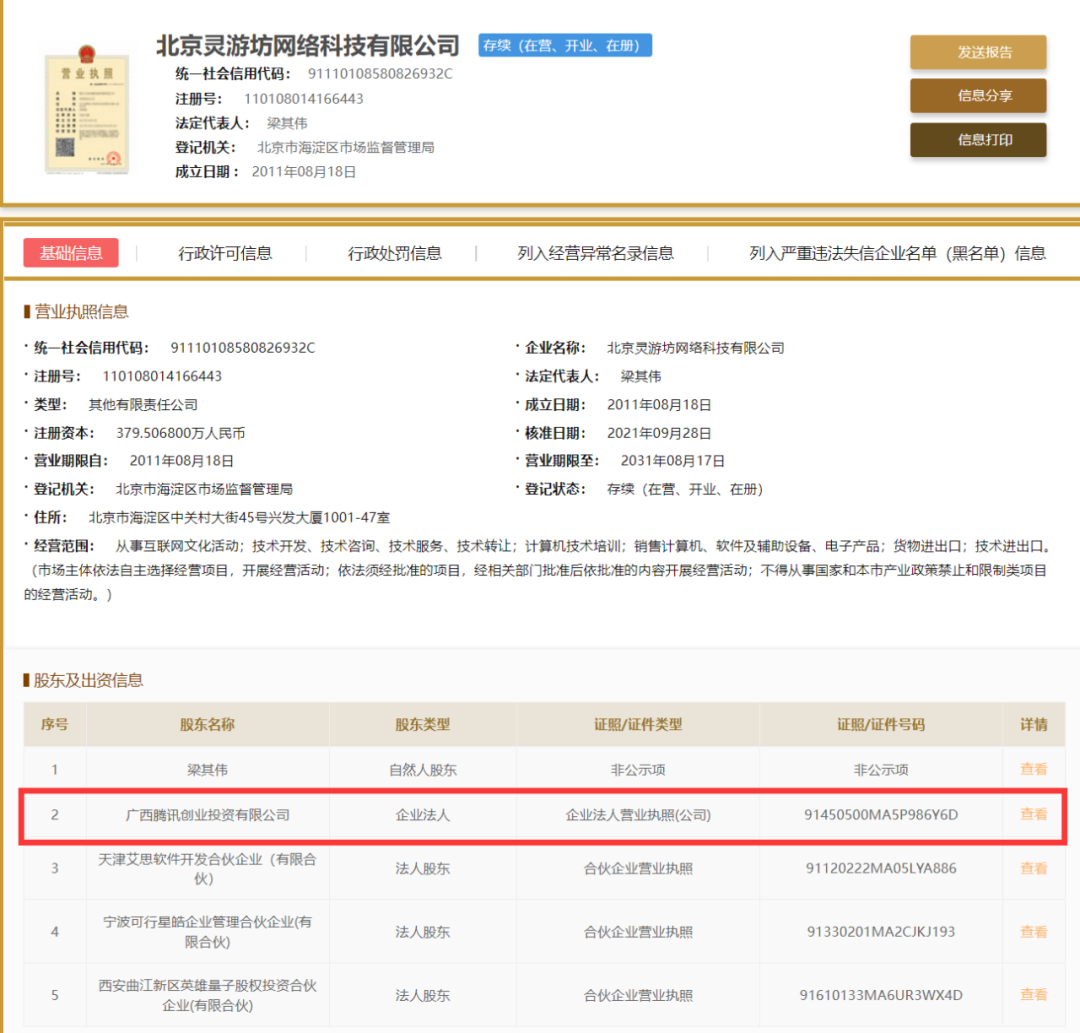 国家企业信用信息公示系统显示,灵游坊注册资金为379.51万,法定代表人为梁其伟,广西腾讯创业投资有限公司为其企业法人,认缴出资额为94.8万,占比25%。