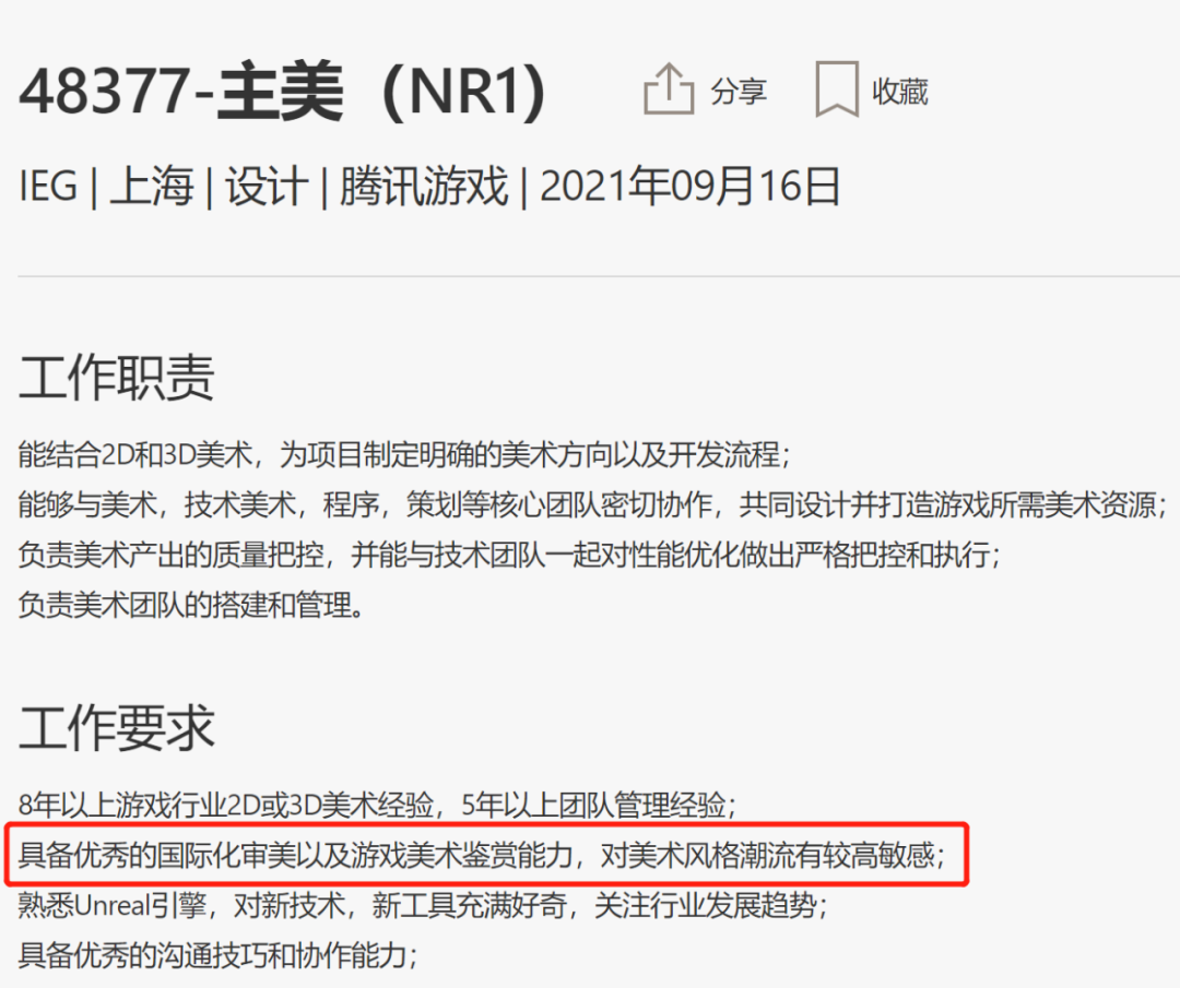 其次,这有可能是一个面向全球用户的项目。多个招聘岗位要求需要熟知国内外行业情况,比如“主美(NR1)”要求具备优秀的国际化审美以及游戏美术鉴赏能力、“高级游戏UI设计师”则要求熟悉国外游戏行业动态等。