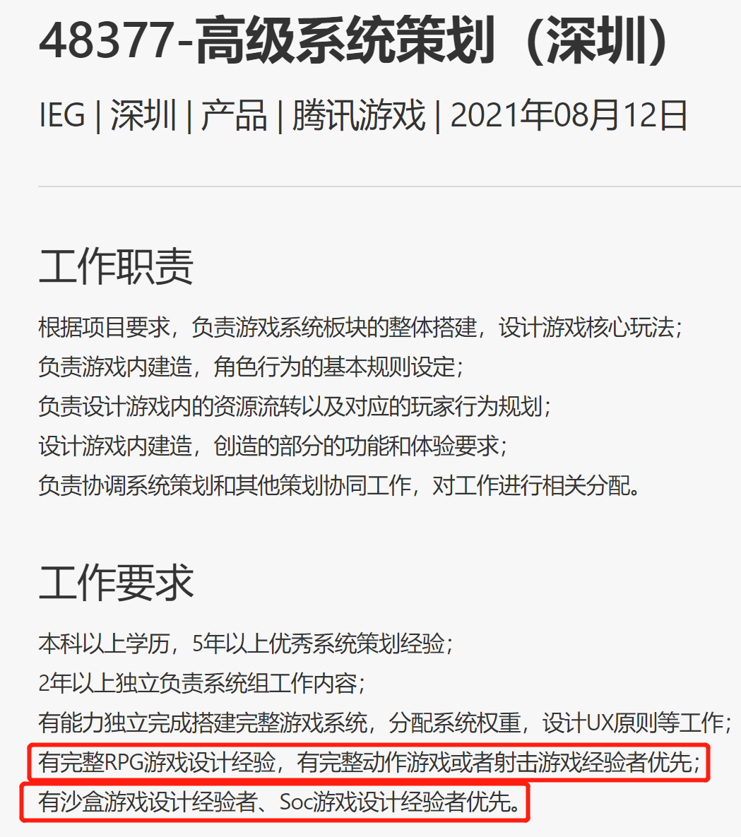 第四,游戏内容应该丰富多元。多个岗位要求涉及到多个游戏品类,比如“高级系统策划”要求有RPG、动作游戏、射击游戏、沙盒、Soc游戏设计经验者优先、“高级文案策划”要求“有完整的mmorpg、开放世界、日式JRPG项目经验优先”,而休闲与休闲竞技游戏被单独标注在了职位名称上。