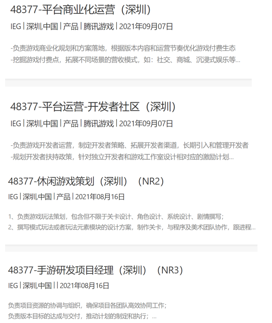 第三,这应该是游戏 + 社交的平台型产品。招聘岗位中包含了“平台运营-开发者社区”、“平台商业化运营”、“版本运营”等岗位,提到了UGC、社区运营等字眼,还有众多游戏向岗位,如休闲游戏策划、手游研发项目经理、新手游玩法策划/数值策划/系统策划等。