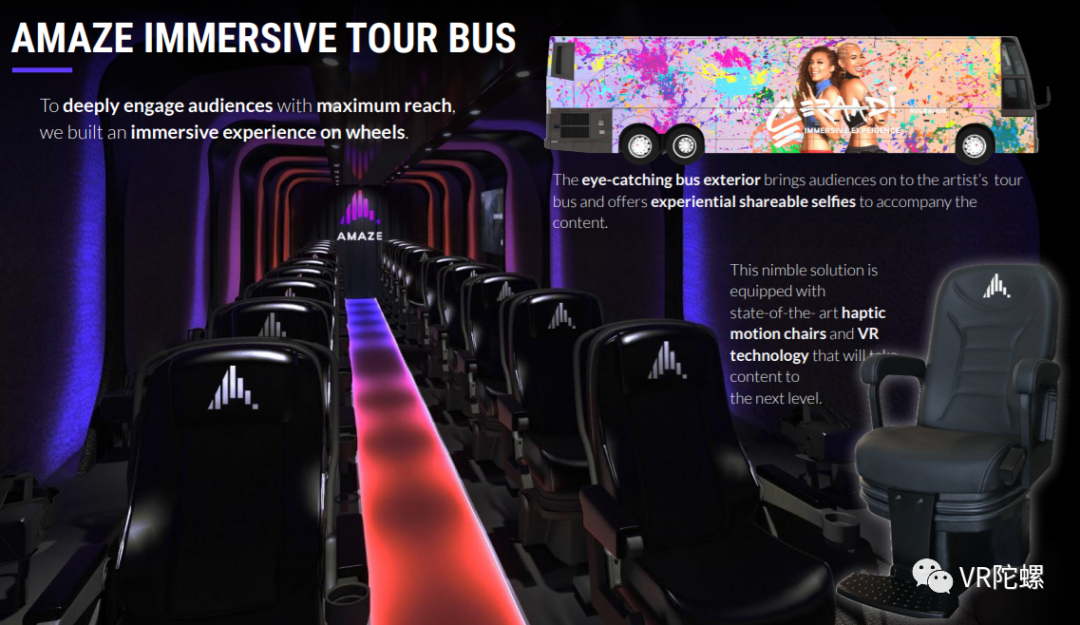 除了巡演巴士,据称AmazeVR的下一个大型项目是推出VR剧场,据称将由一位获得格莱美奖的艺术家为内容制作核心,该活动将在线上和线下平台推出,包括未来会在4DX电影院中配备了动感座椅。剧院落地时间预计是今年年底或2022年第一季度。目前AmazeVR正与环球音乐集团、华纳音乐集团、索尼音乐等厂商进行合作,目的是在未来推出更多IP作品。