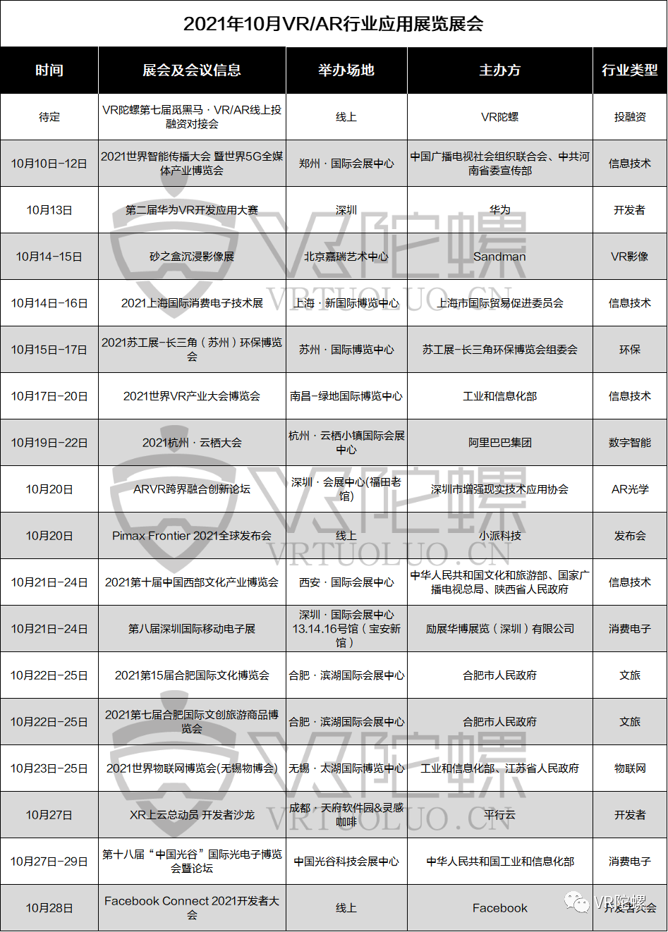 2021年,VR/AR在Quest 2市场表现超预期,大厂商接连入局加码VR/AR业务,元宇宙、数字人、NFT等概念大火等多重因素的影响下显示出复苏迹象。近日字节跳动收购VR硬件厂商Pico入局VR的消息则直接引爆话题,起到了很大的提振行业信心的作用,而且还有可能在接下来一段时间引起大厂商入局VR/AR的联动反应,VR/AR产业或将迎来新的发展阶段。从大的环境上看,在国家的大力推动和支持之下,全民接种疫苗接近尾声,全国疫情也再次得到稳定,线下活动慢慢开始活跃起来。那么在2021年,VR/AR行业将会有哪些活动/展会值得参与?VR陀螺已经收集了2021年10月VR/AR圈展会活动及相关的行业应用展会(以下会议内容由VR陀螺手动整理,如有遗漏请添加微信:vrtuoluo233),完整列表如下: