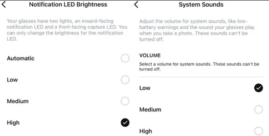 在外观方面,雷朋 Stories 上面有两个指示灯,一个朝内,另外一个朝外。当设备开始录像的时候,会伴随提示音的声音开始录像,录像状态下灯是亮着的状态。用户可以调整提示音的音量,但不能彻底静音,也不能设置关闭灯光。这也是Facebook为了怕别人偷拍,特意设置的指示LED灯,能够在拍摄上亮起提醒别人该眼镜正在拍摄中。雷朋 Stories 配有一个充电盒,用于存放眼镜和给电池充电的,类似于苹果的 AirPods。拍摄时有时候没法进行语音识别,也可以通过右臂顶部的一个按钮进行拍摄--长按可以拍摄静物,短按可以拍摄视频。唤醒词驱动的Facebook语音助手可以在应用程序的设置中关闭。![]()