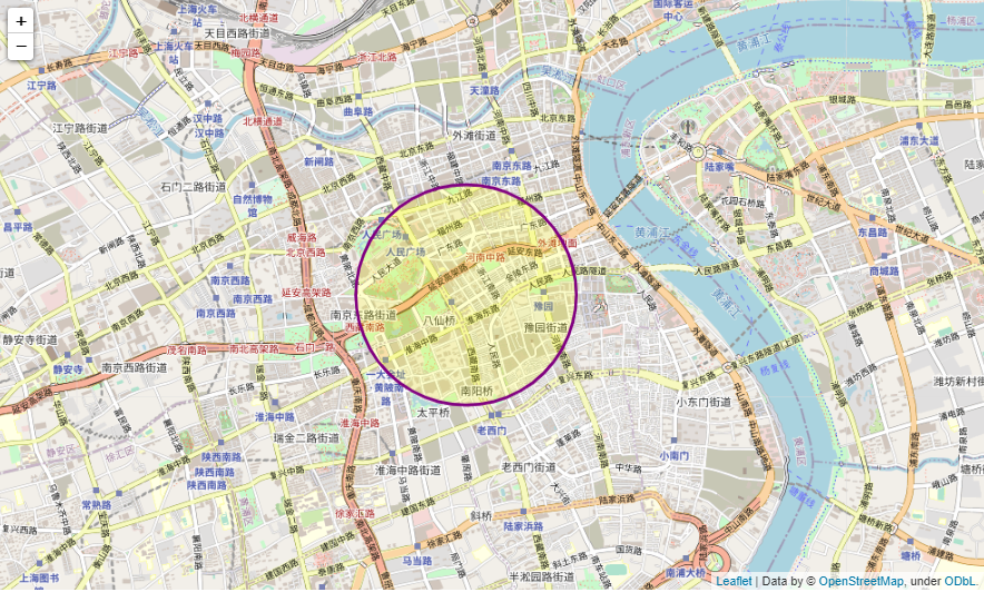 shanghai = folium.Map(location=[31.2304, 121.4737], tiles='openstreetmap',zoom_start=12)folium.Circle(location = [31.2297, 121.4762], radius = 900,color = "purple").add_to(shanghai)shanghai