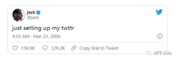 Twitter联合创始人兼首席执行Jack Dorsey的第一条推文(也是 Twitter 历史上的第一条推文)NFT在2021年3月进行了拍卖,最终以惊人的290万美元被售出。作为慈善事业的一部分,Jack Dorsey承诺将本次NFT销售所得全部兑换为比特币,然后再捐赠给“Africa Response”慈善组织。