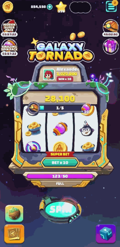 在《银河旋风》中,玩家需要消耗类似于体力或“次数”转动机器,每当三个图标连成直线时,玩家就可以获得相应的金币或道具奖励,道具除了即时生效的游戏加成外,还有不同星级的卡牌等内容,允许玩家进行养成和组队。