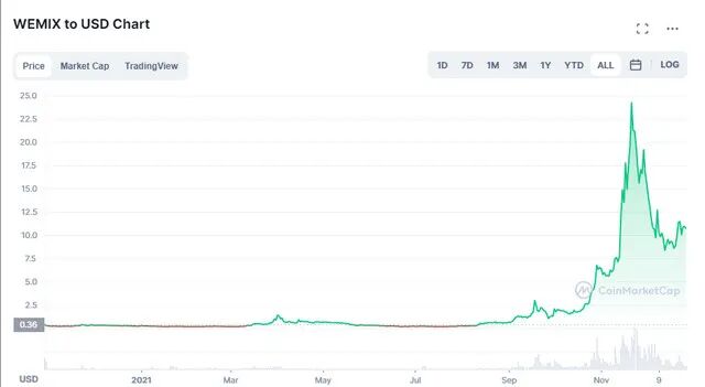 目前1WEMIX的价格约为10.77美元,虽然这以价格与11月底的历史最高价23美元相比跌了超过一半,但依然约是《Mir4》1年前手游版刚上线时0.2852美元的38倍。