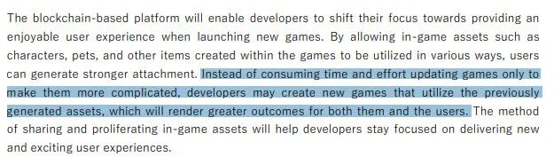 而娱美德认为,区块链技术将改变这一切,通过区块链对玩家赋能,放开玩家对游戏内角色、宠物等使用的限制,玩家会主动挖掘游戏的深度,对现有的游戏内容产生更强的依赖性。而游戏公司“与其花费时间和精力更新游戏只是为了让它们变得更复杂,开发者可以利用已有的资产开发新游戏”。