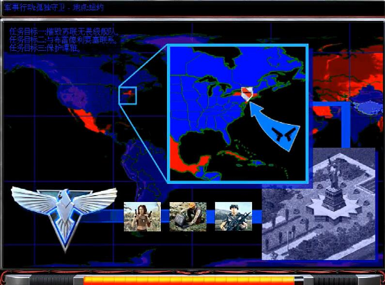 本期内容涉及红色警戒2原版盟军战役任务头两关“孤独守卫”与“危机黎明”,根据关卡开始时的背景地图,苏联在拿下墨西哥后,首先尝试从美国东部的纽约进攻美国,但是被指挥官(也就是玩家)给拦住了,于是转头从墨西哥用钢铁洪流向北推进,一路拿下新墨西哥、亚利桑那、犹他等西部州,可最终还是在科罗拉多州被指挥官打败。