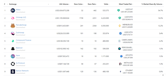 以Heco上的头部去中心化交易所MDEX为例,链上最新数据显示,截至3月19日,MDEX锁仓资产总额累计23.07亿美金,24h交易量高达36.55亿美金,是Uniswap 24h交易量的3倍之多,稳居CoinGecko全球DEX排行榜第一。