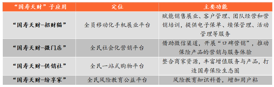 中国人寿是内地最早的保险机构之一,其前身可以追溯到1949年成立的原中国人民保险公司,也是国内首家在A+H+G(上海、香港、伦敦)三地上市的保险机构。截至2020年,中国人寿已连续14年入选世界品牌实验室(World Brand Lab)发布的《世界500强》。2012~2018年,国寿在科技领域先发布局、修炼内功,以组织结构和底层系统为发力重点。2019年起,历经业绩滑坡后的国寿痛定思痛,启动“重振国寿”战略,数字化转型侧重于业务层面的赋能与延展。2012年11月召开的十八大是中国人寿数字化的起点,时任总裁杨明生积极响应政策号召,提出了“科技国寿”战略,要推动国寿往“科技驱动型”现代金融保险企业转型。同年,国寿开始着力打造特色的集团化IT架构,“科技国寿”的三步走战略却直到2015年才起步。中国人寿的科技化目标分为三步,由“网上国寿”跃至“智慧国寿”,再进一步实现“科技国寿”。在战略初期,中国人寿提出了“+互联网”与“互联网+”双轮驱动的概念。“+互联网”即推动传统业务的线上化转型,推进在线经营。“互联网+”则是侧重于创新层面,注重互联网与传统业务的结合,依托网络平台开创新业态和新模式。2015年,“网上国寿”孵化出了 “国寿天财”系统,定位为销售支持平台集群,赋能营销活动,推动保单管理、客户经营、续保管理等向线上转移。