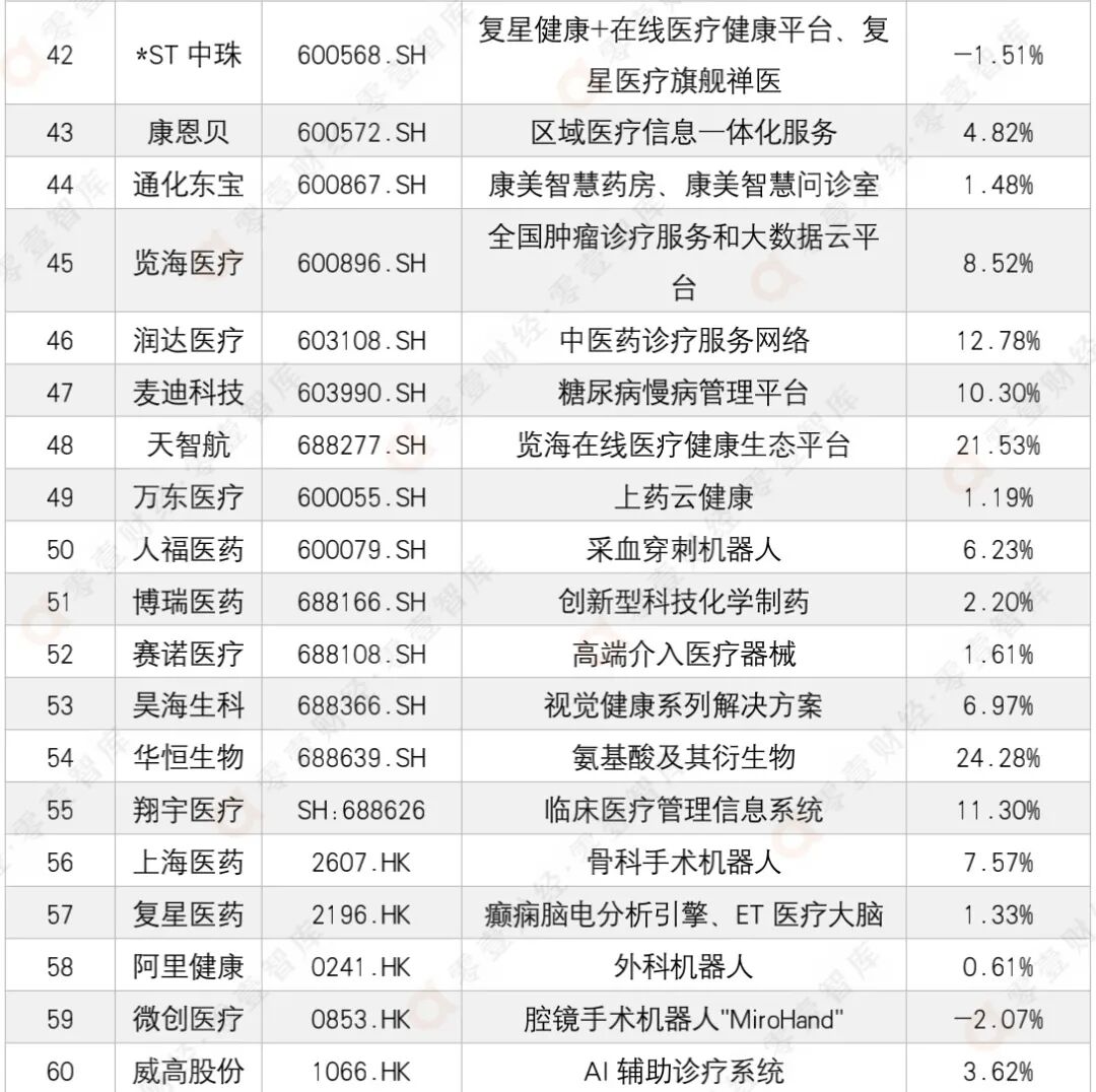据零壹智库不完全统计,目前我国医疗科技上市企业超过100家。本报告剔除掉科技属性不强的企业,挑选了63家公司观察其二级市场股价动态。