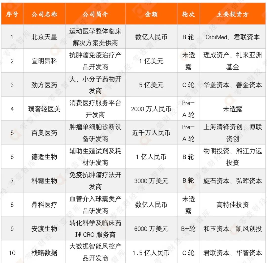 据零壹智库不完全统计,上周共有22家医疗科技企业获得融资,融资总额超过65.1亿人民币。其中,有15家企业获得了亿元级别融资,最高者劲方医药,金额达5亿美元。