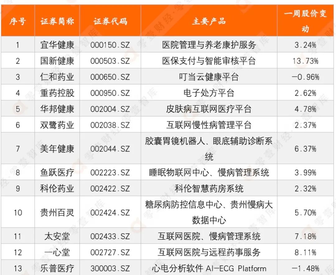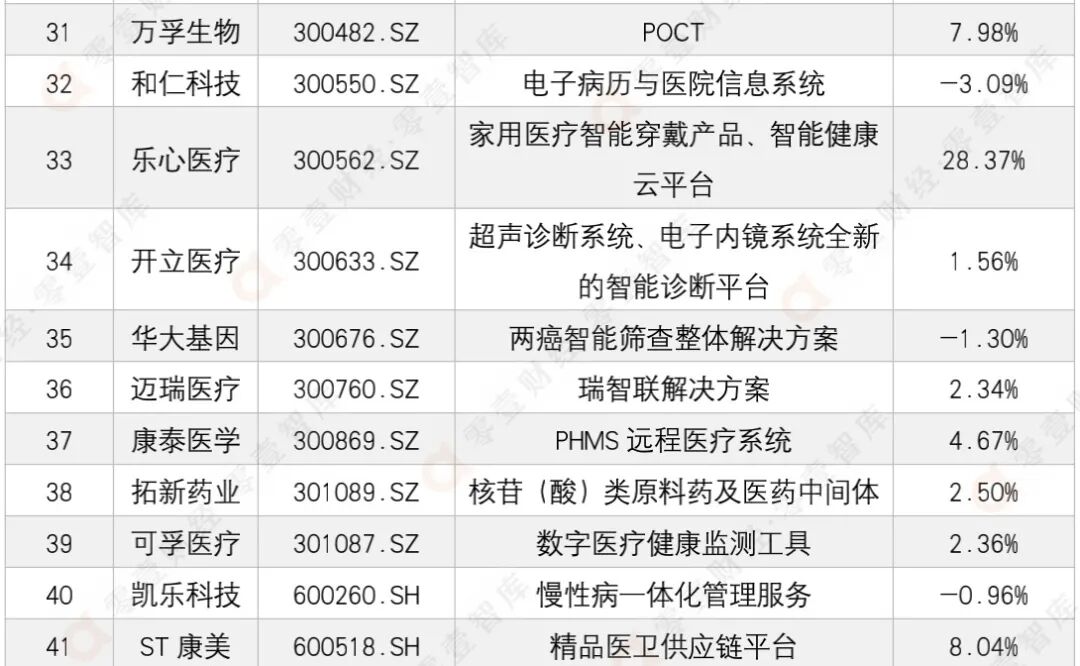 上周医疗科技板块有9家企业股价下跌,跌幅最大的为和仁科技(300550.SZ),下跌幅度达3.09%;54家上市企业股价上涨,涨幅最大的为红日药业(300026.SZ),上涨幅度达46.36%。