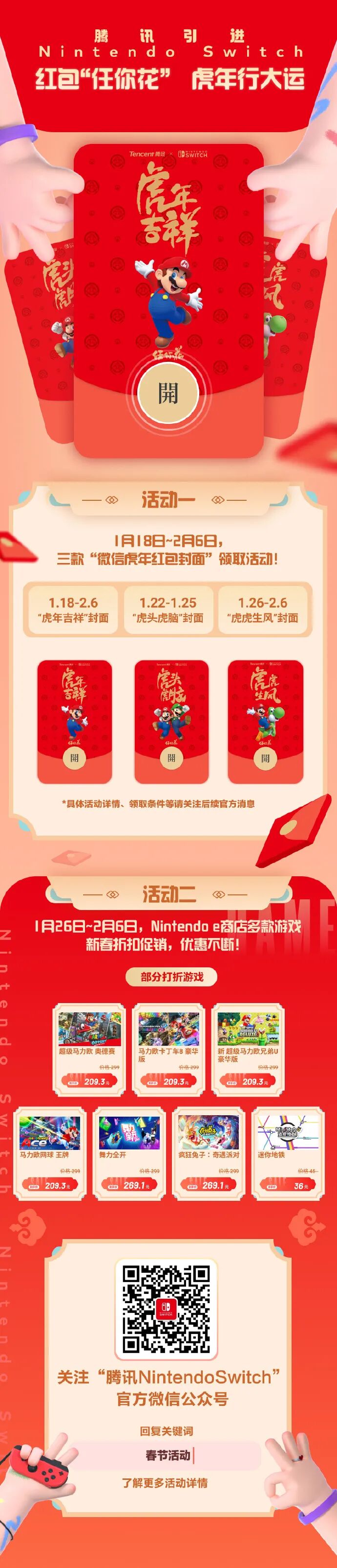 腾任宣布,国行NS虎年贺新春活动将于1月18日正式开启,持续至2月6日,活动包含以下几个部分。