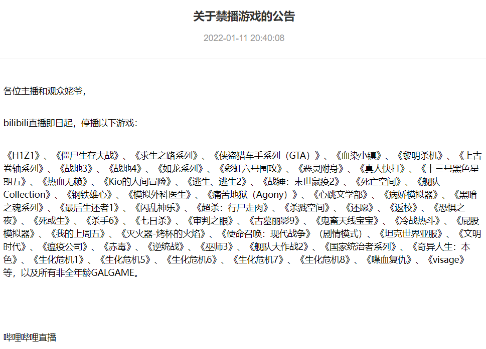 B站发布“关于禁播游戏的公告”,其中显示,即日起,停播包括《给他爱》系列、《上古卷轴》系列、《如龙》系列等等作品、以及停播所有非全年龄Galgame。