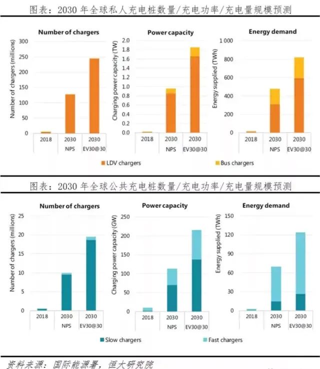 据2019年国际能源署IEA发布《Global EV Outlook 2019》报告和恒大研究院任泽平的研究显示,到2030年全球私人充电桩预计保有量分别达到12800~24500万台,总充电功率达1000~1800GW,总充电量达480~820TWh;公共充电桩预计保有量达到1000~2000万台,总充电功率113~215GW,总充电量70~124TWh。