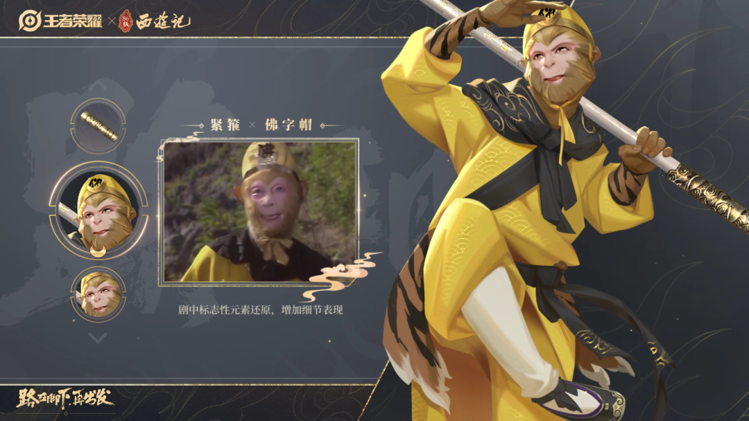 有些旋律、影像好像刻在我们DNA的链条里,一响起就打开了回忆的匣子:一只猴子从石头中冲天而起、举起一万三千五百斤的如意金箍棒的孙悟空……这些让人瞬间联想起了86版《西游记》中的画面。这部经典陪伴着很多人走过了童年,如今也已成为了国创的经典。作为国创的头号IP之一,《西游记》中唐僧师徒也位居中国文化最知名的人物形象之列,你有没有想过,这一幕幕经典会在王者峡谷中重现呢?今天,王者荣耀携手86版《西游记》,国创经典强强联手,用数字技术还原致敬经典,传承传播中国经典文化,不仅推出史诗级英雄皮肤,还给玩家准备了更多惊喜,带你一起重温一代国人的集体精神记忆。《西游记》陪伴了一代又一代人的成长,在时代的见证下成为国创经典,又在新的时代里焕发出活力。此次,西游英雄们来到王者峡谷,将再次踏上取经之路。相信在新版本上线的孙悟空史诗级英雄皮肤,定能够唤起你的青春回忆。王者峡谷,破晓清晨,当黎明的曙光洒在跃起探路的行者身上,熟悉的86版《西游记》经典探望动作,这就是我们心中那个不畏险阻,不屈不挠的孙行者。86版《西游记》,一经播出就成为打不破的收视神话。伴随着一代代人的青春,成为难以超越的经典。每一个80、90年代出生的孩子,都曾有过自己的“西游梦”。可能在家里的玩具箱底下,还压着一面美猴王面具,或者一根红黄相间的“金箍棒”。作为传承数百年的经典作品,《西游记》被后人进行了无数次的改编。其中,86版《西游记》电视剧的角色形象最深入人心。当《云宫迅音》的音乐一响起,许多人立马重回那个充满了奇幻色彩的世界。86版《西游记》中的孙悟空疾恶如仇、古道热肠、七十二变,除恶锄奸从不手软。可以说,他的形象不但满足了孩子们的好奇心与想象力,也承载着国人的是非观与英雄观。几十年后,一听到“吃俺老孙一棒”,那个时而狡黠时而幽默的形象就浮现在脑海中。孙悟空这一荧幕形象几乎成为家喻户晓的经典IP。有了经典IP的加持,当王者荣耀与86版《西游记》强强联合,又会擦出怎样的火花?39年前,在那个资金和技术匮乏的年代,86版《西游记》的主创们克服重重困难,凭借坚定意志和奋斗精神,创造出这部传世经典,完成了一次时代的突围。39年后,王者荣耀感召于主创们的匠心精神,将循着前辈们的足迹传承经典,续写奋斗,同时赋予时代新的注解,呈现出一个“年轻”的西游。作为《西游记》中最重要的角色,王者荣耀选取了孙悟空做经典还原。在视觉表现上,以剧中的经典造型和桥段作为核心。为了更好地体现86版《西游记》中孙悟空的灵动王者荣耀在展示待机、局内待机、技能动画、行走动作等都往西游记的方向进行了动画调整,并以86版《西游记》中经典故事桥段为原点,展现孙悟空神通广大、勇敢无畏,致敬经典桥段。孙悟空是花果山的齐天大圣,历经500年,从孙大圣变成了孙行者,头上的凤翅紫金冠变成一道紧箍。而不变的是那颗敢于斗争的心。孙悟空的火眼金睛,鲜明的黄黑配色着装深入人心,在孙行者皮肤中,对其经典的毛脸雷公嘴面貌、月牙紧箍、虎皮裙等标志性元素进行还原,并增加了细节表现。刻有“如意金箍棒”的武器闪闪发光。随着经典的《云宫迅音》响起,孙悟空在空中翻腾变换为雄鹰,落地时从耳中掏出金箍棒 ,一番行云流水的耍棍后,以经典姿势结束,挠耳探望,灵气十足。技能展示上,强化孙悟空的普通攻击,如意金箍棒金光四射,行云流水。一技能“护身咒法”,重现了打翻炼丹炉的场景;二技能“斗战冲锋”,“一个筋斗云,十万八千里”。孙悟空踏着筋斗云威风凛凛;三技能“如意金箍”,定海神针搅动通天河的名场面留下86版《西游记》的经典记忆。“呔!吃俺老孙一棒!”经典口头禅既出,定海神针砸向东海,泛起旋涡,从此孙悟空便有了自己称手的武器“如意金箍棒,一万三千五百斤”。在听觉设计上,王者荣耀还邀请了西游记原班声优老师们,重新唤起玩家对经典的美好记忆。此外,王者荣耀从原作曲许镜清老师取得授权,在其指导下融入了王者风格。通过东方幻想的气韵来表达取经的征程感,在旋律中穿插取经的艰辛与低谷的变奏。更特别的是,曲中还融入了这个时代对天宫的浪漫想象。经典之所以是经典,在于不同时代它都焕发新光彩,传承中也有新演绎,这次还融合当下许多流行表达,让皮肤留下时代印记。深受年轻人喜爱的“表情包+语音”玩法,也将在峡谷中得到全新的演绎。斩妖除魔,不惧艰险的孙悟空,是西游路上的先锋。九九八十一回,是西游师徒的修行考验,也是86版西游剧组的匠心历练。而这一回,86版《西游记》与王者荣耀相约峡谷,国创经典IP的活化被赋予了更多数字文化价值,将会成为大家共同新的征程,新的起点。正如此次合作的品牌Slogan所言:路在脚下,再出发。
