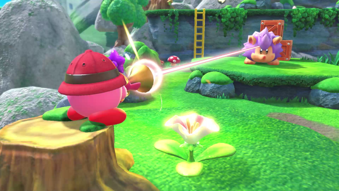 和以前横版的《星之卡比》游戏不同,这次的新作改为了关卡制,有些类似于《超级马力欧 3D世界》。但和《3D世界》又有些不同的是,本作的每个关卡都是可以360度全景探索的,是类似《奥德赛》那种自由视角。每个关卡到达终点并不是主要目标,更重要的是我们需要在每个地图中,尽可能多地找出全部被隐藏起来的瓦豆鲁迪,看着颇有些《奥德赛》找月亮的味道了。