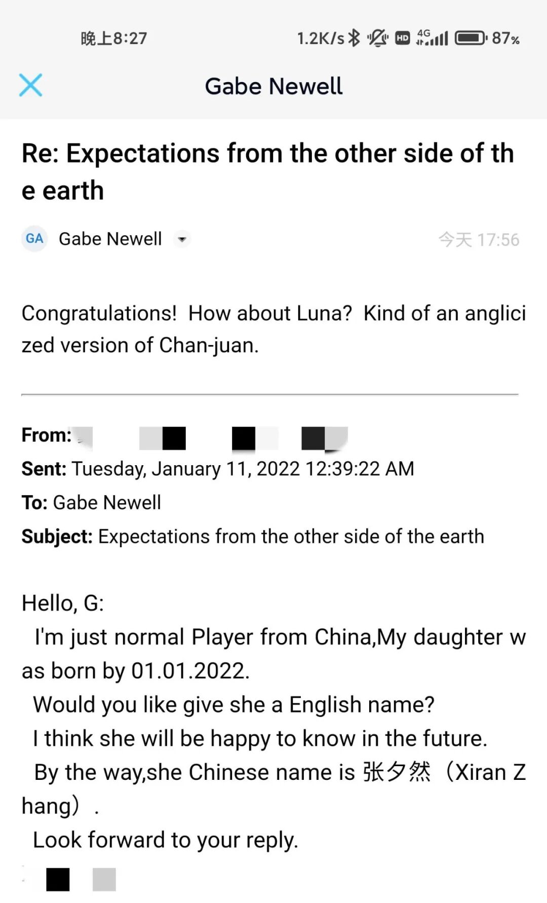 根据reddit上一篇帖子显示,最近一位中国玩家给Valve创始人Gabe Newell(即玩家常说的G胖)写了一封邮件,希望G胖能给这位玩家的女儿起个英文名,结果得到了G胖的亲自回复。