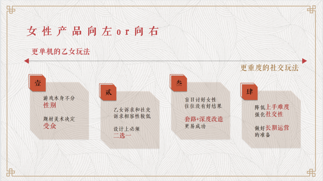 在这里,我们也拉了一个方向表,女性产品是向左还是往右?我们有一些论断,第一,是我们刚才说的游戏本身不分性别,题材、美术决定你的受众。