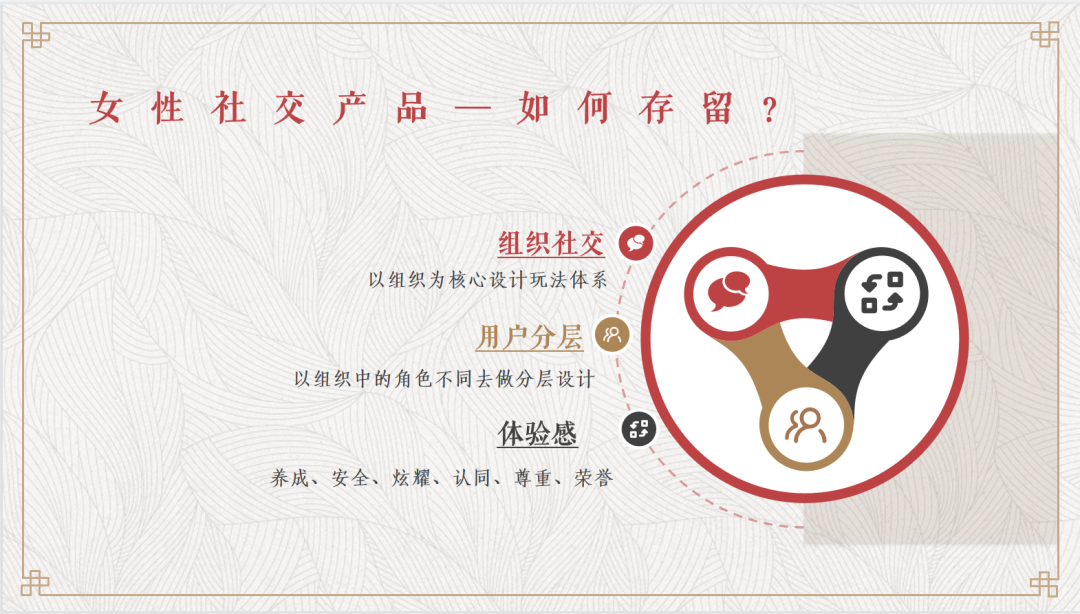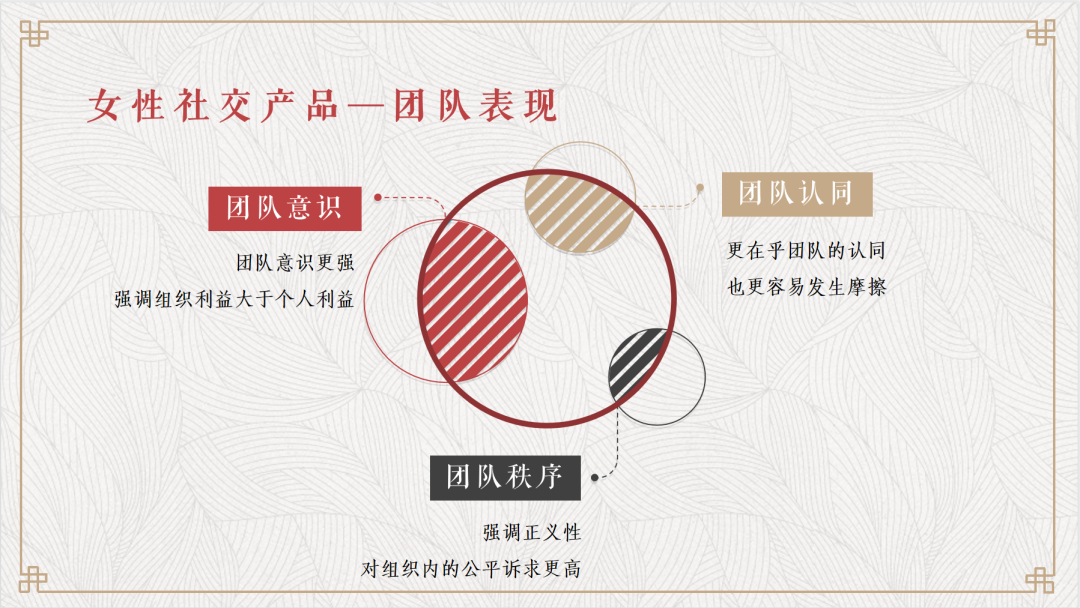 最后,女性的团队秩序要求比男性高,女生在团队中一般都会非常强调正义性,她对公平公正的诉求更高,男性不是,男性一般有大佬偏好,打不过就加入,我肯定是跟强的一方。至于这个事情有没有公正公平,相对没有女生那么在乎。所以我们觉得在组织社交体系中,女性跟男性是有所不同的,而具体到产品上,它的形态意识也会有不太一样的地方。