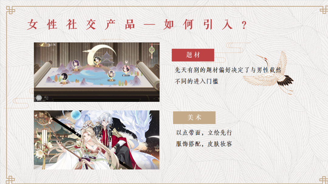 目前市面上90%的产品定位还是做人虚交互产品,当然有些团队已经开始意识到社交重要性,想往这个方向发展。其表现在重美术、重人设、轻玩儿法,很多产品大多粗暴地认为女性是没有“游”商。甚至我们之前接触过游戏团队也有一种固有的认知,觉得女性玩不了战斗,甚至很多要把战斗体系砍掉。我个人认为没有太大必要,因为关键点不是在这里。