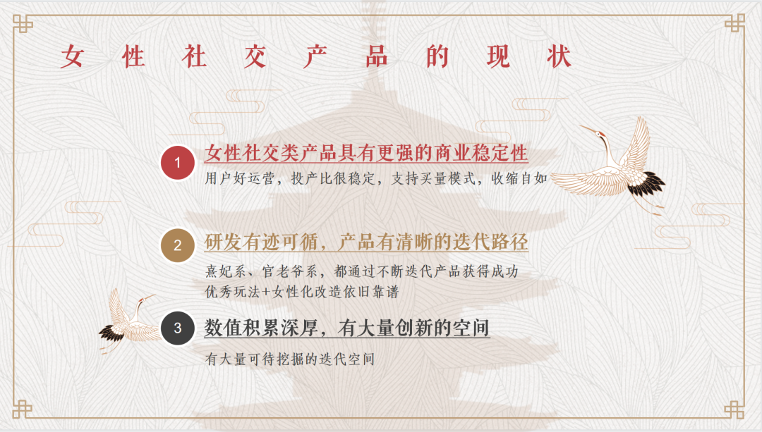 最后是,在传统成熟框架下,女性社交产品数值积累深厚,有大量创新的空间。也就是说,你不需要在这一基础框架下不用有太多的怀疑,只要把数值设计好,中间有大量的可以创新的空间,而且能挖掘的玩耍框架也比较多。这是我们感受到的目前社交类产品的一些现状。