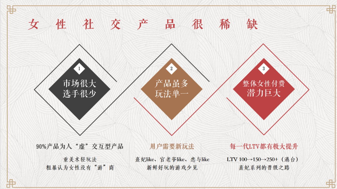 在他看来,女性社交类游戏细分赛道有几大特点,一是,产品具备更强的商业稳定性;二是,研发有迹可循,产品有清晰的迭代路径;三是,数值积累深厚,有大量创新的空间。而当下,女性社交市场很大,产品很稀缺。