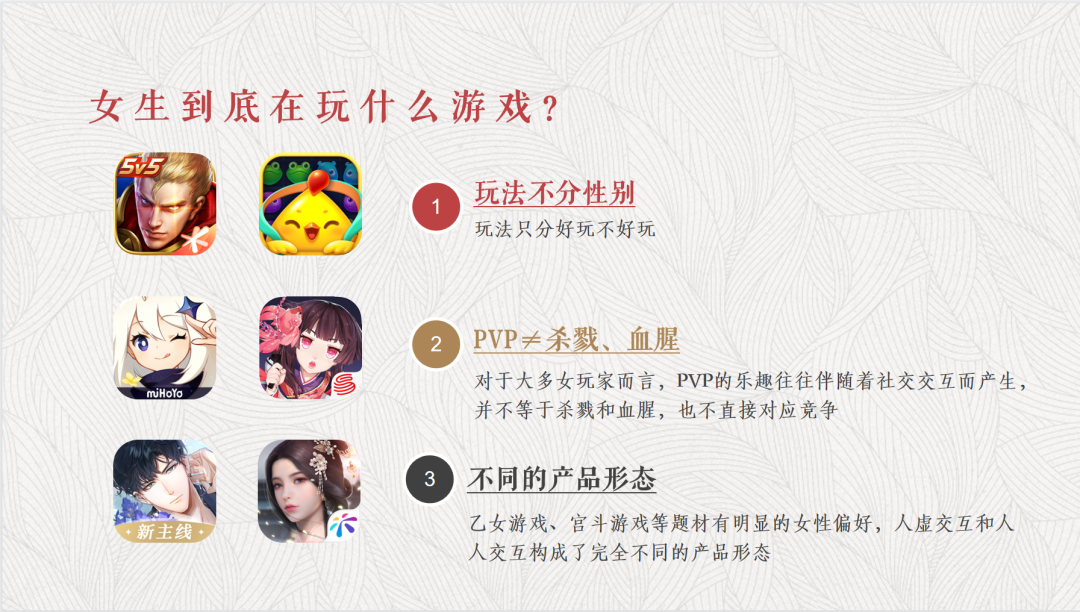 比如说我的目标就是要把你打掉,其实不是,她的PVP价值更多的是产生社交。所以你会发现在很多的女性游戏里面,排行榜甚至比直接的战斗还有用。为什么呢?排行榜会让她在这个过程有成就感,因此我们认为对于女性来说,PVP在女性中是不等于所谓男性理解的国战、杀戮、血性等。