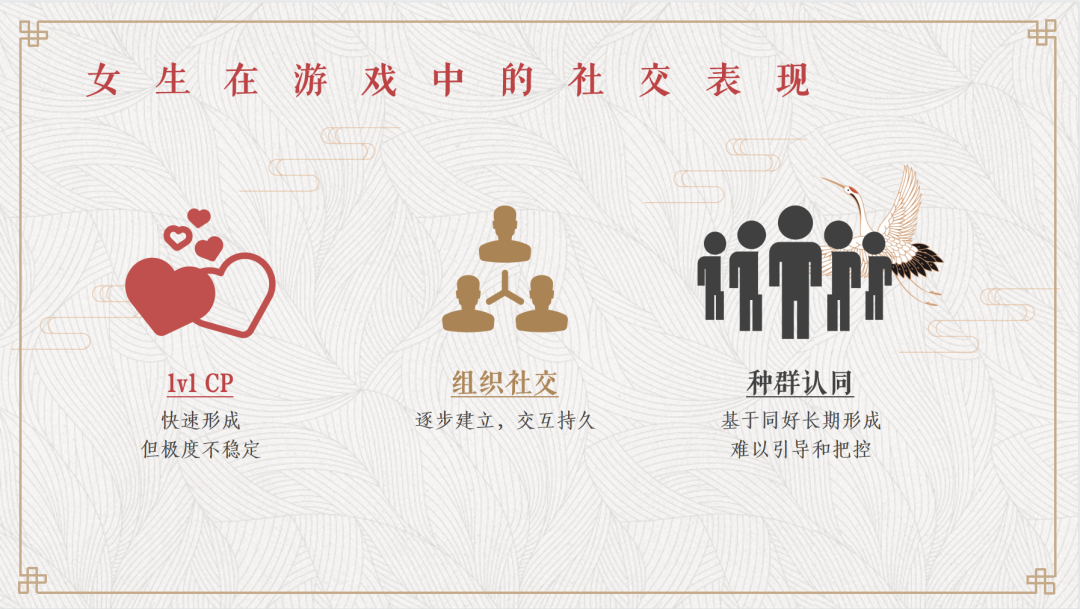 最后来说一下,我们自己对女性社交的理解,女生在游戏中会产生一系列社交表现,第一,她会在游戏里组CP,这个是大家感受最明显的,很多女孩会在游戏里面组CP,当然也有可能女女组CP,女男组CP。这种社交关系的特点是比较容易快速形成,只需要两个人参与,但是CP关系在游戏里面不太稳定,对于一个游戏的生态系统不好说是好还是坏。