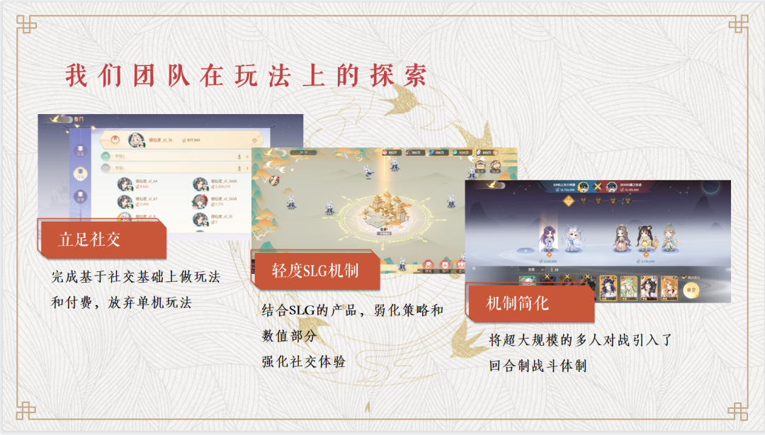 另外,把机制简化了,因为涉及到组织社交,一定要有超大规模的多人对战。所以我们用回合制的方式解决,而没有用即时战斗的方式。我们还把整套机制,把规模缩小了一些,最多做到60人对战。这是我们团队探索的方向,也不能说一定能成,因为产品涉及的因素太多了,但我们自己觉得这个方向是OK的。