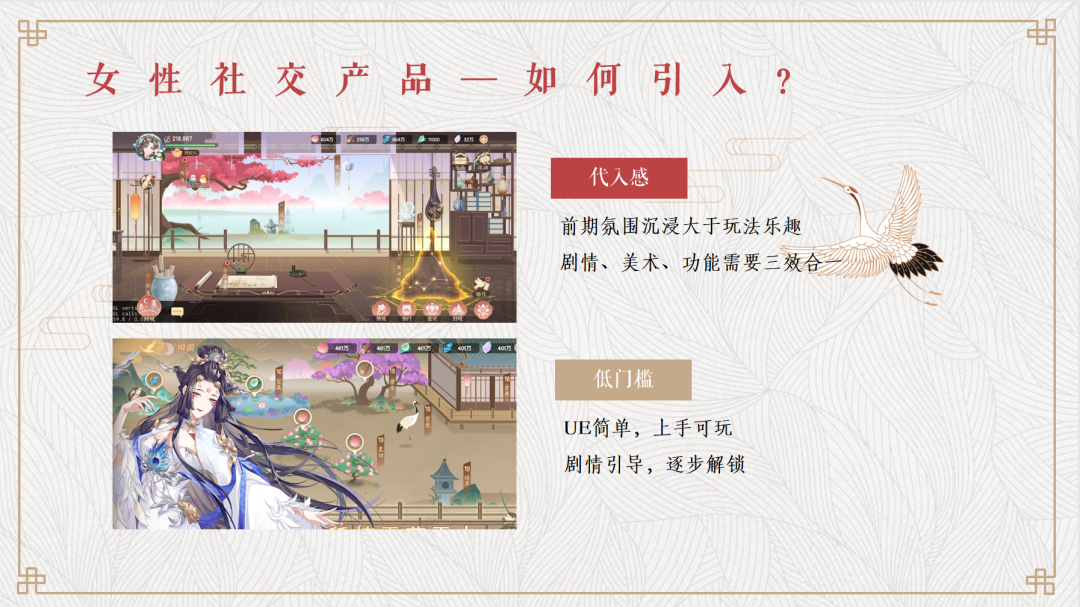 三是,代入感。这也是游戏在女性引入时的一个特点,你要把前期的氛围沉浸做好,尤其是在用户刚进游戏时,把前期的氛围沉浸做好远比玩法本身带来的乐趣重要。